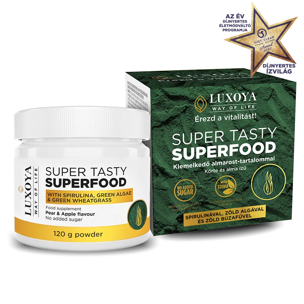 A mai rohanó világban egyre nehezebb odafigyelni arra, hogy szervezetünk megkapja mindazokat a tápanyagokat, amelyekre szüksége van a mindennapi energiához és egészségünk megőrzéséhez. A SUPER TASTY SUPERFOOD – Körte-Alma ízesítésű spirulinát, zöld algát és zöld búzafüvet tartalmazó étrend-kiegészítő italpor egy praktikus és ízletes megoldás azok számára, akik természetes forrásból szeretnék támogatni vitalitásukat és immunrendszerüket.